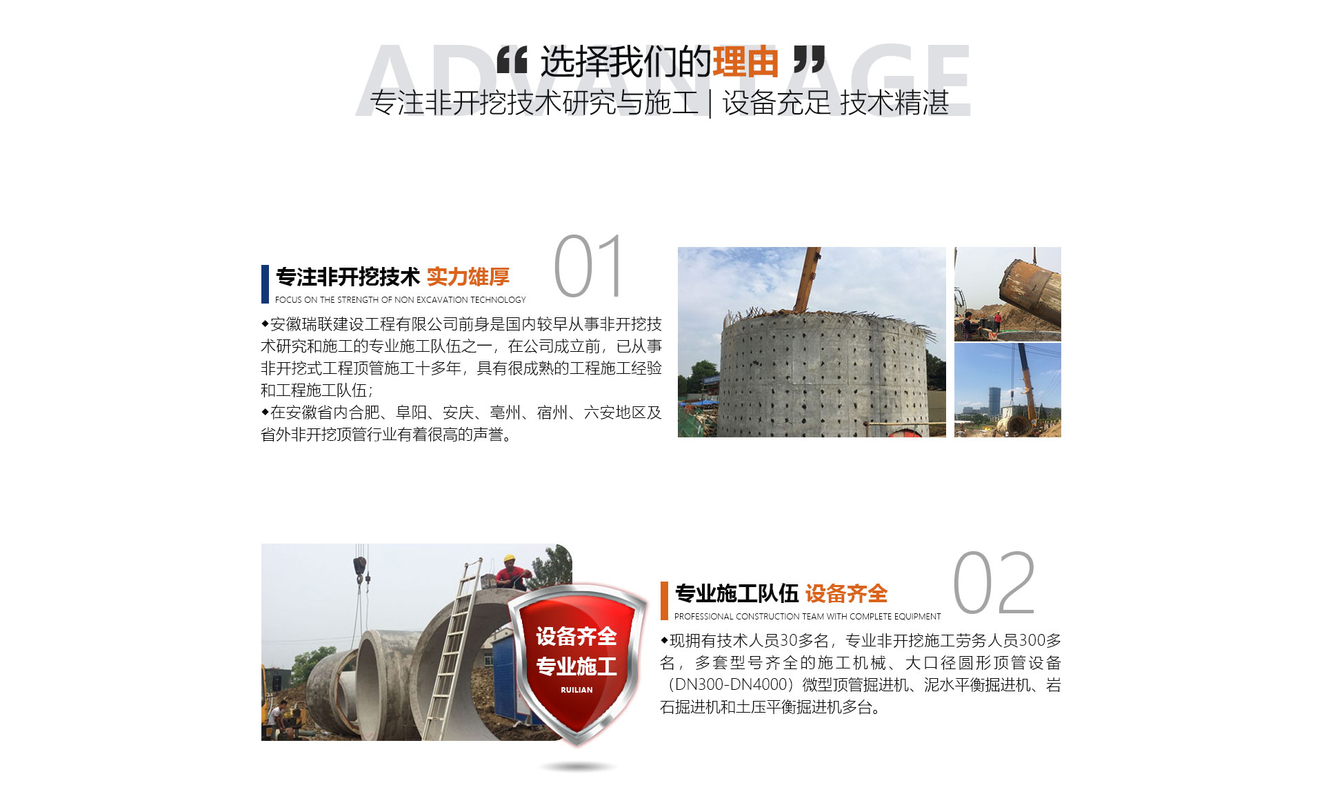 安徽瑞聯(lián)建設工程有限公司前身是國內(nèi)較早從事非開挖技術研究和施工的施工隊伍之一,在公司成立前,已從事非開挖式工程頂管施工十多年,具有很成熟的工程施工經(jīng)驗和工程施工隊伍,在安徽省內(nèi)合肥、阜陽、安慶、亳州、宿州、六安地區(qū)及省外非開挖頂管行業(yè)有著很高的聲譽。面對日益擴大的市場,公司于2014年正式成立,公司擁有勞務分包及市政公用工程總承包資質(zhì)。公司優(yōu)勢(文字):現(xiàn)擁有中高技術人員30多名,非開挖施工勞務人員300...